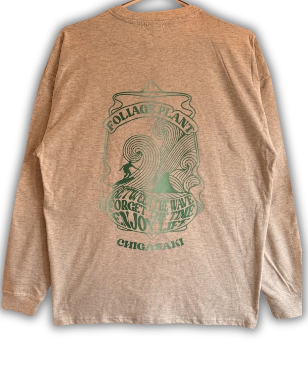 海とサーフカルチャーの街、茅ヶ崎をイメージしたデザインをドロップショルダーのゆったりとしたサイジングのロングスリーブTシャツにプリント。