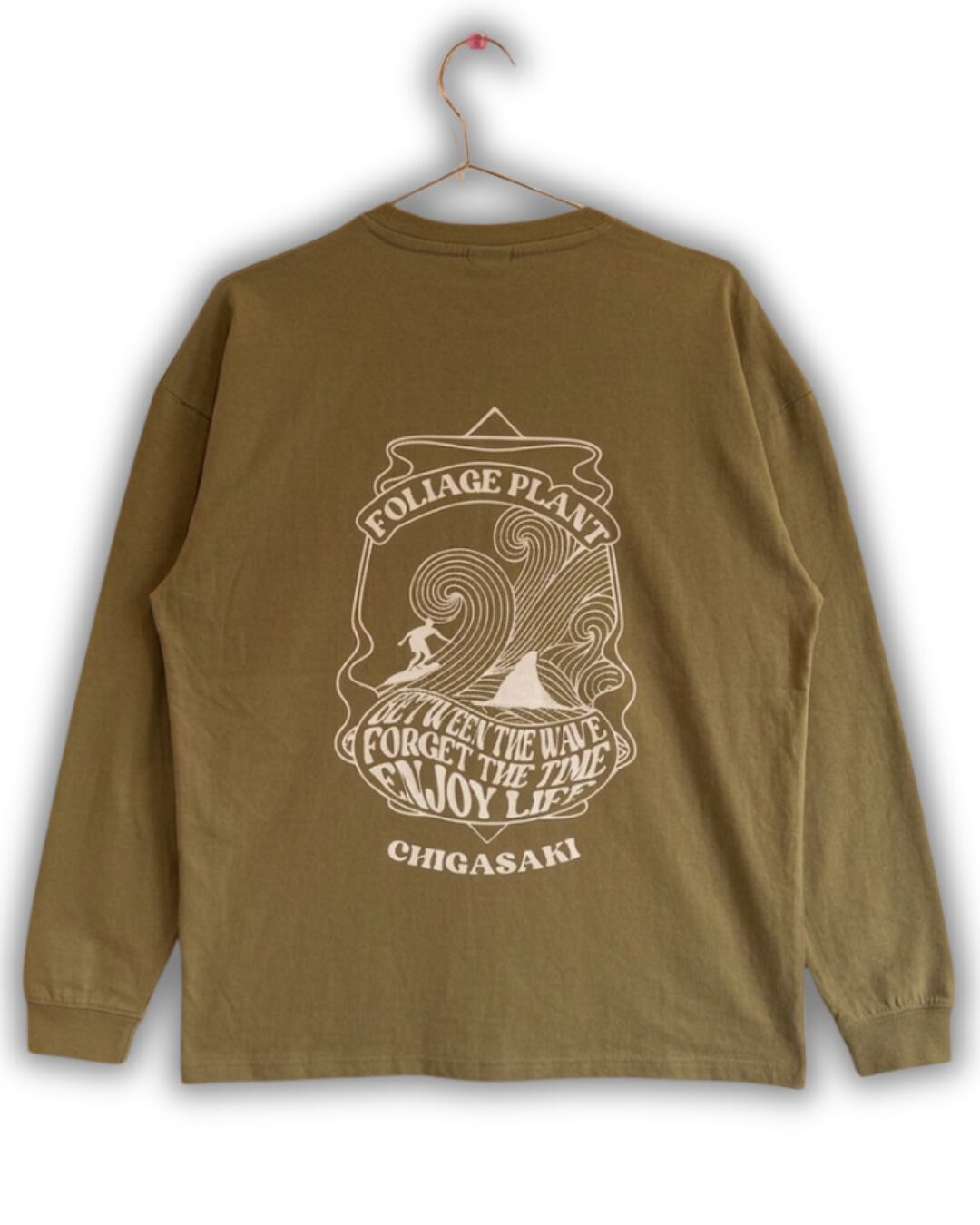 海とサーフカルチャーの街、茅ヶ崎をイメージしたデザインをドロップショルダーのゆったりとしたサイジングのロングスリーブTシャツにプリント。